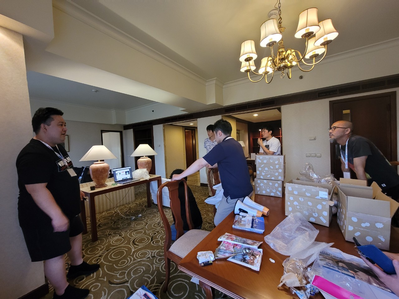 食事後、各自ホテルの部屋に戻り30分休憩後ブース出展用に日本から持ってきた最中などをもって嶋崎副委員長がジャパンナイトの荷物置き用に特別に手配した会場近くの部屋に集合しました。