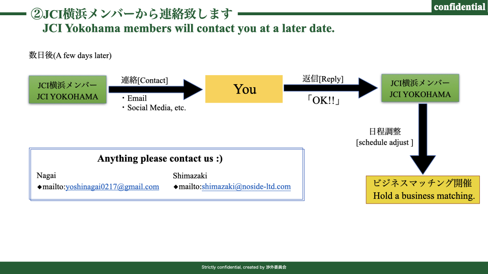 その後、渉外委員会メンバーとリーダーでコミュニケーションをとり申込者へ連絡をする流れです。