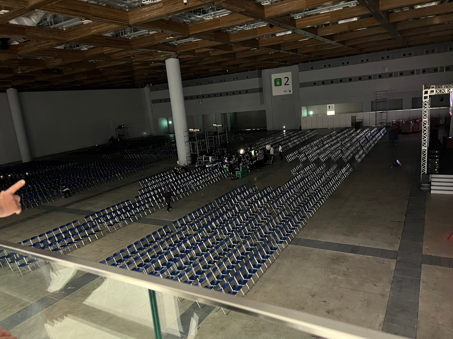 オープニングセレモニーの行われる会議棟の会場近くで受け付けっぽく机が並んでいたので永井委員長が「注意されるまでそれとなく登録受付してよう」と登録場所を設置!