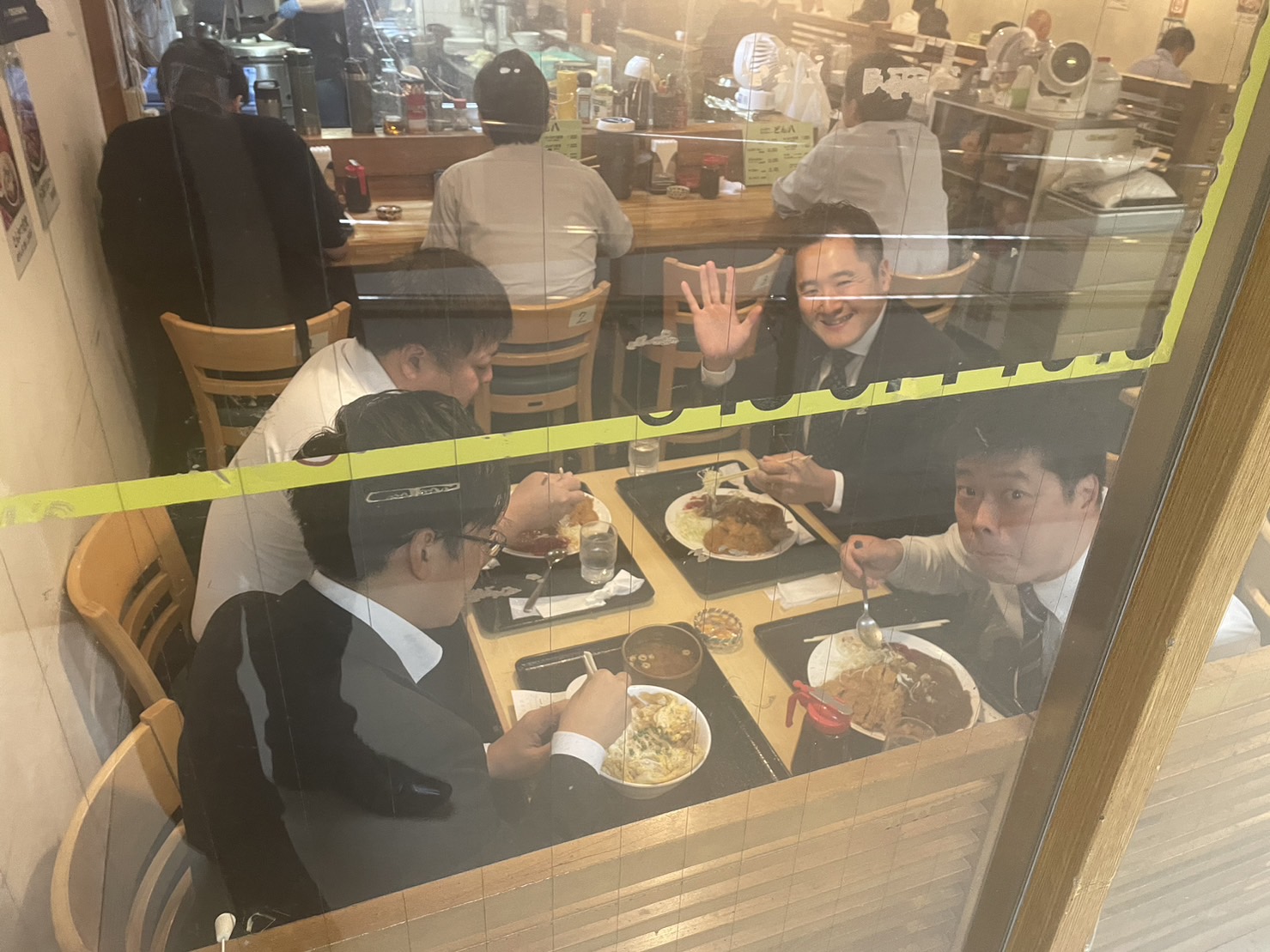 産業貿易センターの地下で集合して昼食中偶然通りかかったお仕事中の竹崎副委員長に盗撮された1枚です。