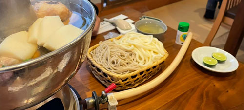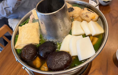 湯葉、真蒸(魚のすり身)、飛龍頭(魚のすり身に銀杏や木耳など具沢山)、かしわ(若鳥のもも肉)、九条ねぎ、ほうれん草、菊菜、すだち、そば、うどん。それぞれが全てのうま味を染み込ませ想像以上の美味しさでした。