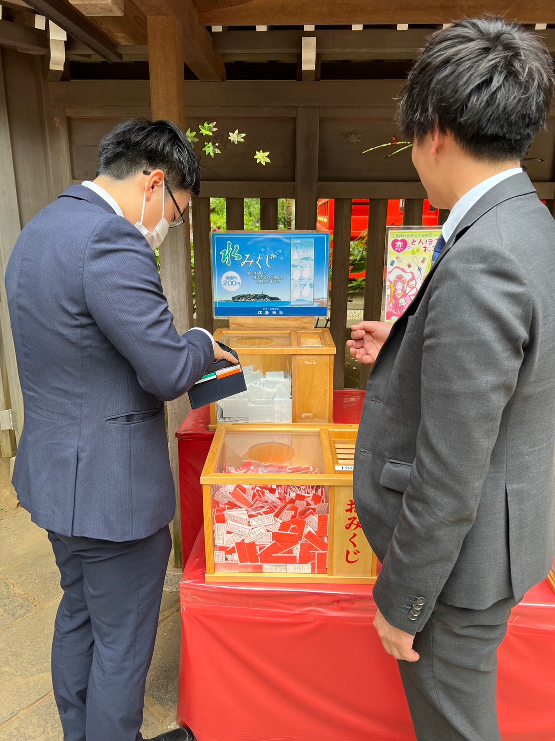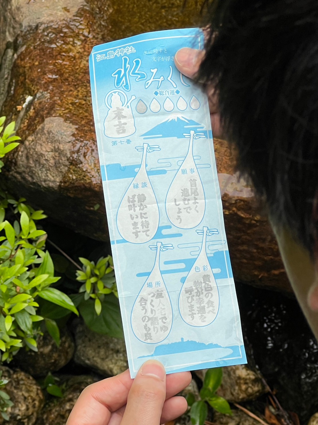 また、しばらく登りますと沖さんが、水みくじを見つけやってみたいと近づきました。