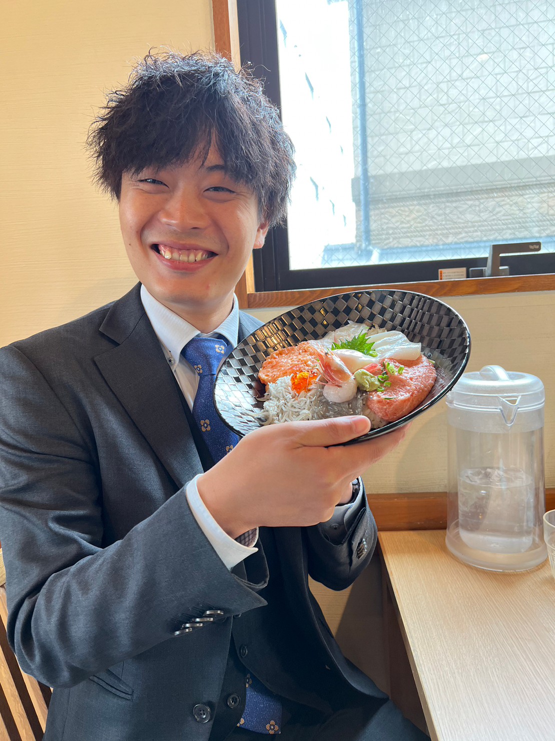 海鮮丼の大盛を頼んでご満悦の沖さんです。